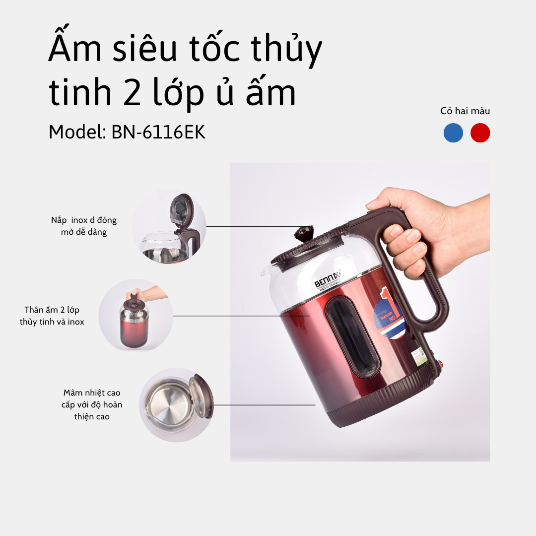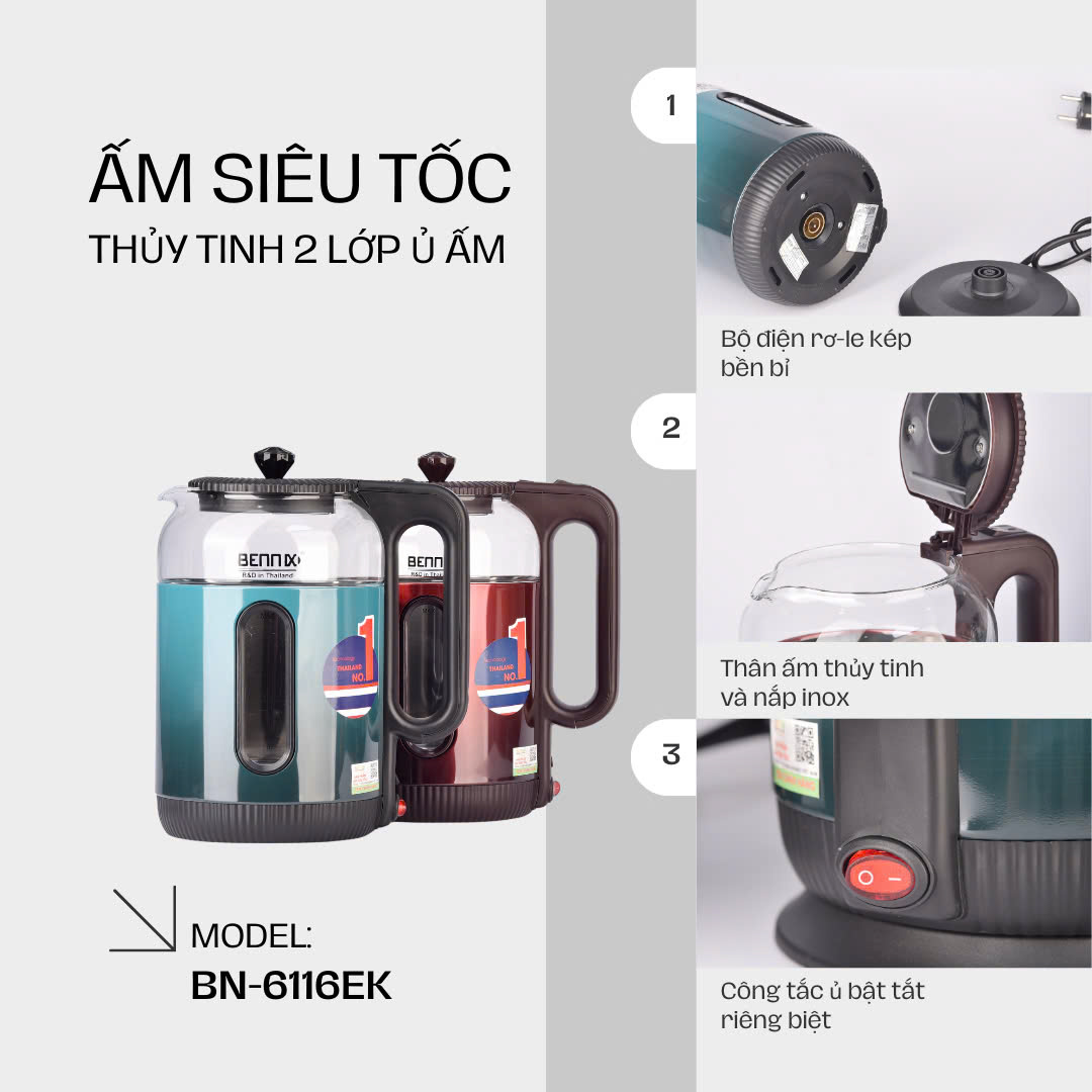 🔥 Ấm Siêu Tốc Thủy Tinh 2 Lớp Cách Nhiệt Bennix BN-6116EK giữ ấm tức thì, mang lại sự tiện lợi chỉ với một cú nhấn nút, giúp bạn luôn có nước nóng sẵn sàng cho mọi nhu cầu.