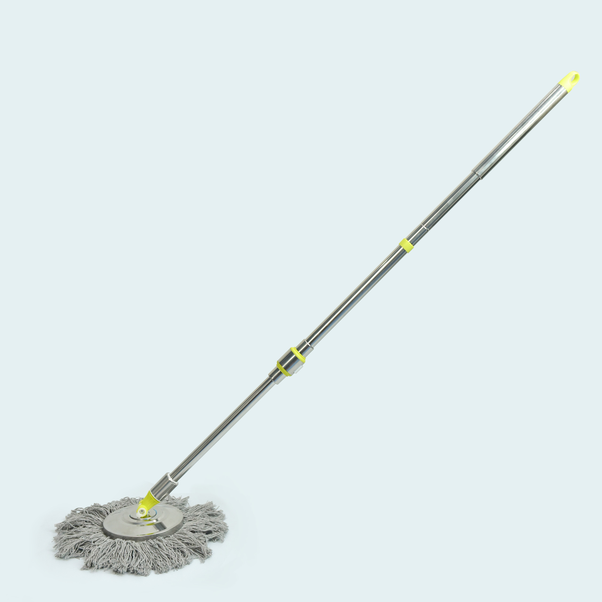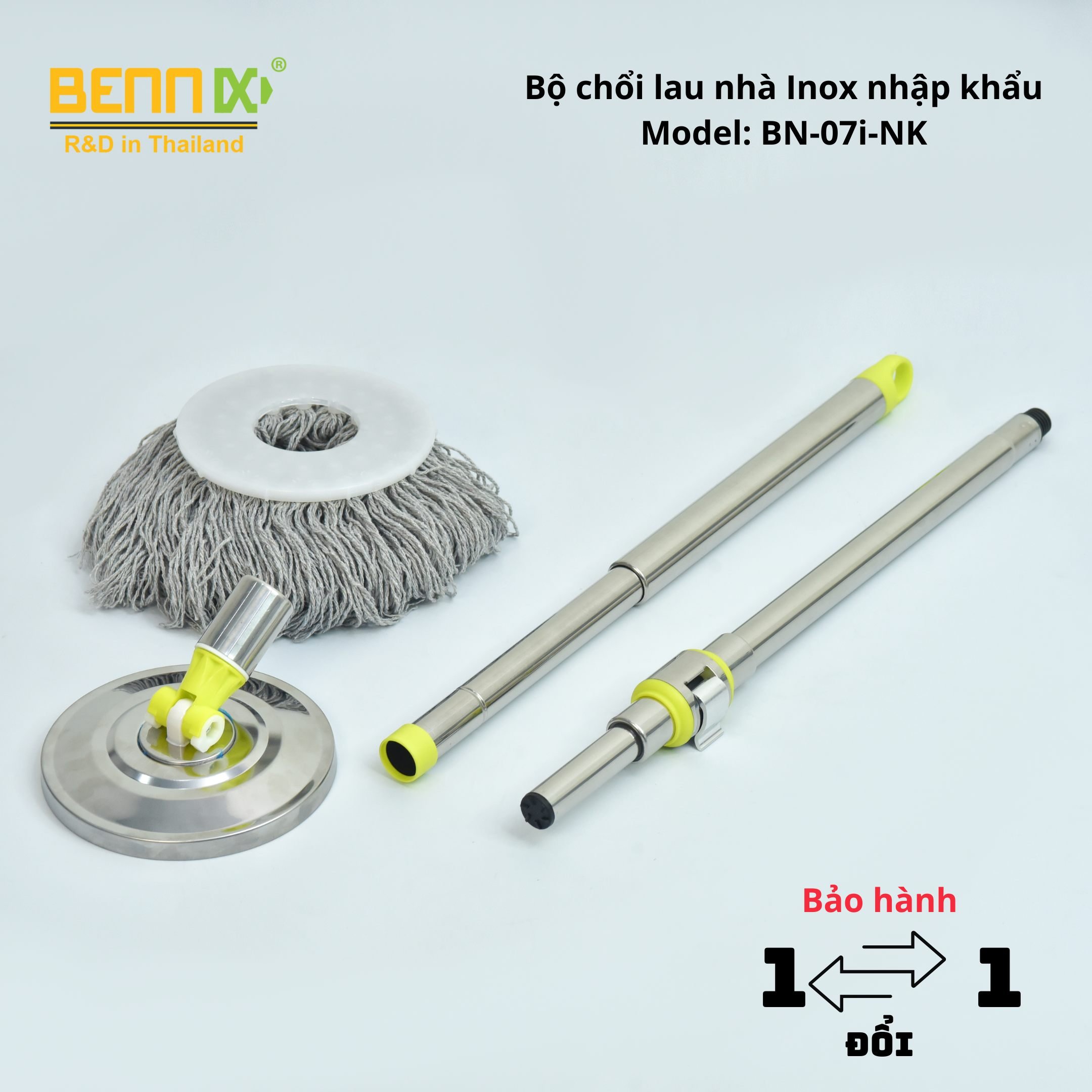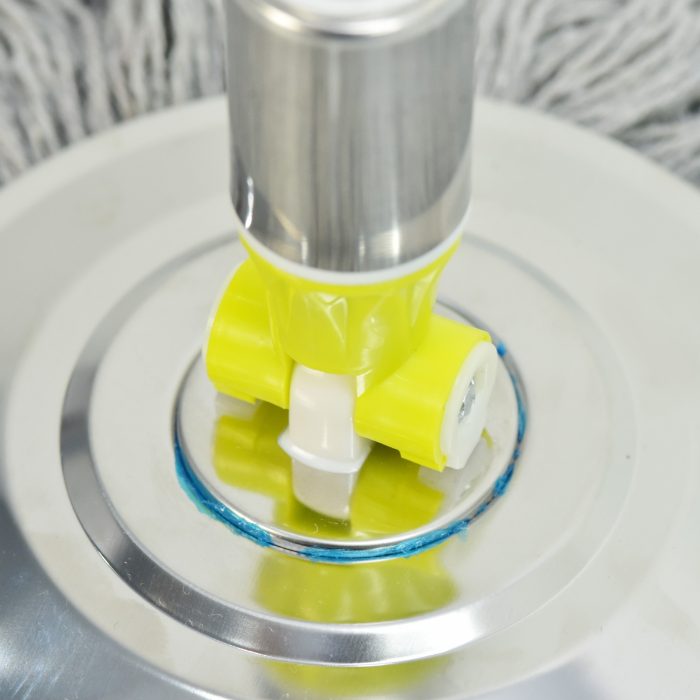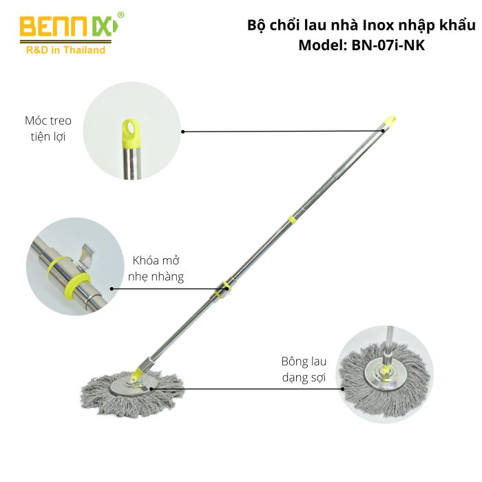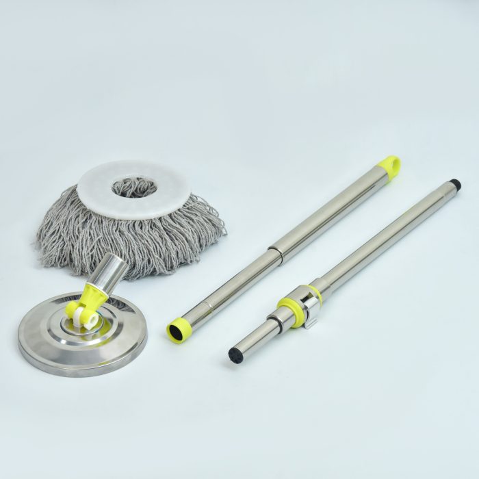 Cán bằng inox 304 có tay cầm bọc nhựa PP chắc chắn. Bộ phận tạo chuyển động bằng thép và nhựa siêu bền. Bàn xoay inox cây lau nhà 360 được làm từ inox 304 sáng bóng, siêu bền.