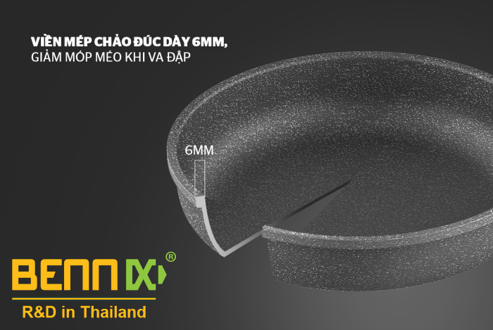 - Thân chảo được làm từ hợp kim nhôm đúc nguyên khối siêu bền theo công nghệ đúc Hàn Quốc. Miệng chảo dày dặn dày 0,6cm có khả năng chống va đập rất tốt, hạn chế móp méo. Chất liệu nhôm còn có khả năng dẫn nhiệt tốt, tỏa nhiệt đều giúp món xào, rán, nấu được ngon hơn.