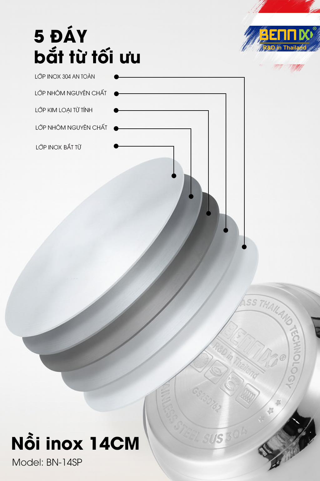 Đáy từ 5 lớp dày dặn: Tối ưu hóa hiệu suất bắt từ, truyền nhiệt nhanh và đều, giúp tiết kiệm điện năng/gas và hạn chế cháy khét cục bộ.