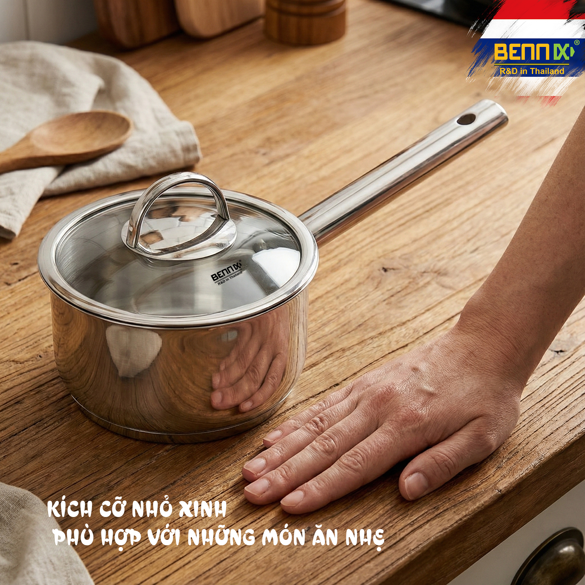 Tay cầm chống nóng: Cán inox dài, thiết kế cách nhiệt an toàn, dễ dàng cầm nắm và thao tác.